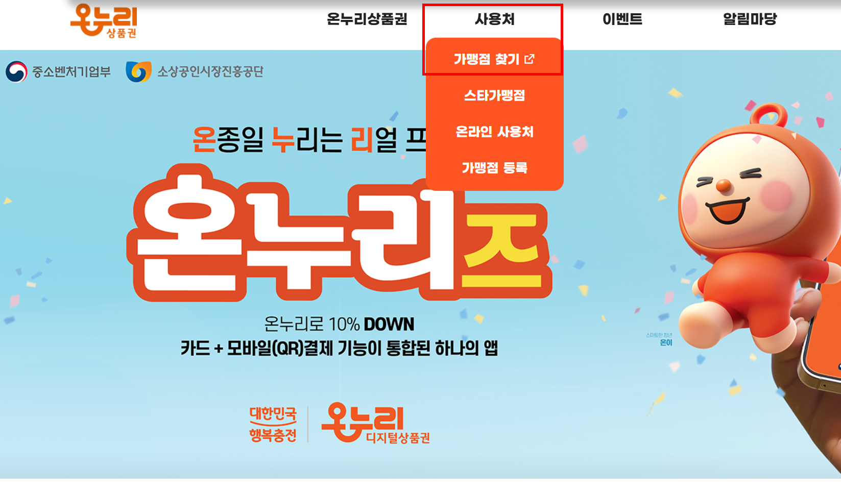 - 가맹점 찾기: 온누리상품권 가맹점 검색 → 사용처 > 가맹점 찾기