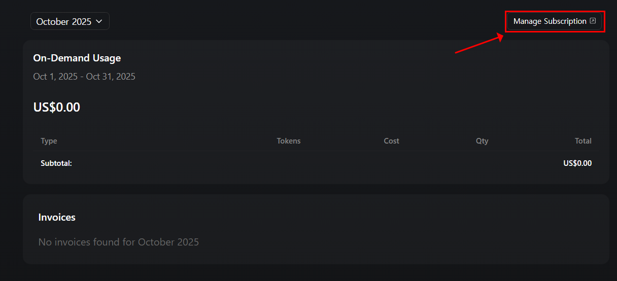 - 결제 내역 확인 페이지 우측 상단에 있는 [Manage Subscription] 버튼 클릭
