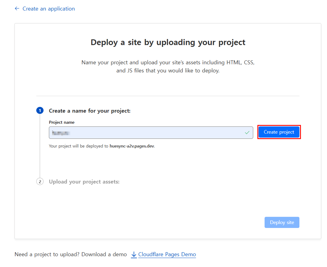 2) 새 프로젝트 생성: 프로젝트 이름 입력 → “Create project” 클릭, 프로젝트 도메인으로 2차 도메인생성됩니다(ex : https:// yourproject.pages.dev)
